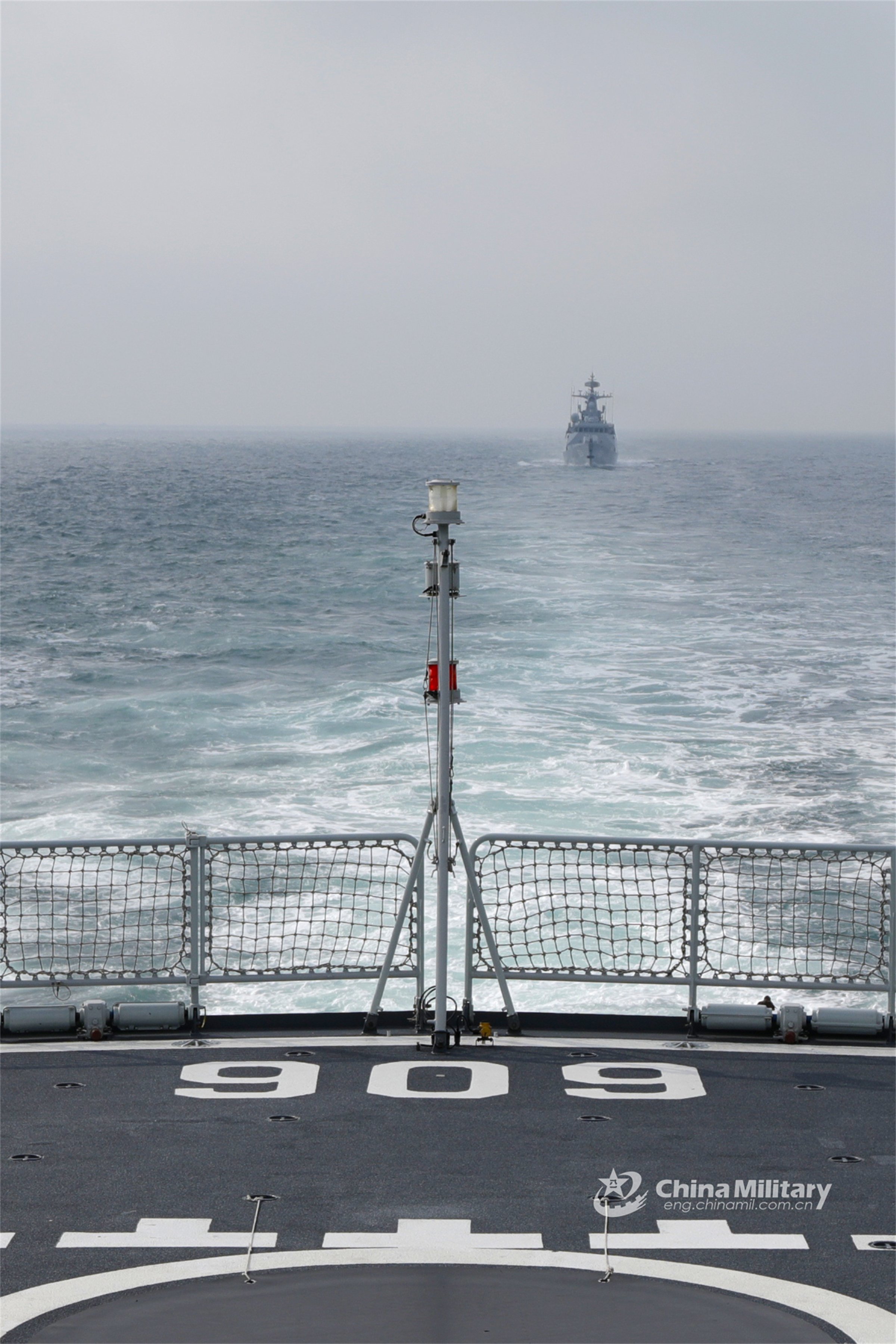 Two warships attached to a frigate flotilla with the navy under the PLA Northern Theater Command sail in formation during a combat training exercise held on January 6, 2023. (eng.chinamil.com.cn/Photo by Wang Guangjie)