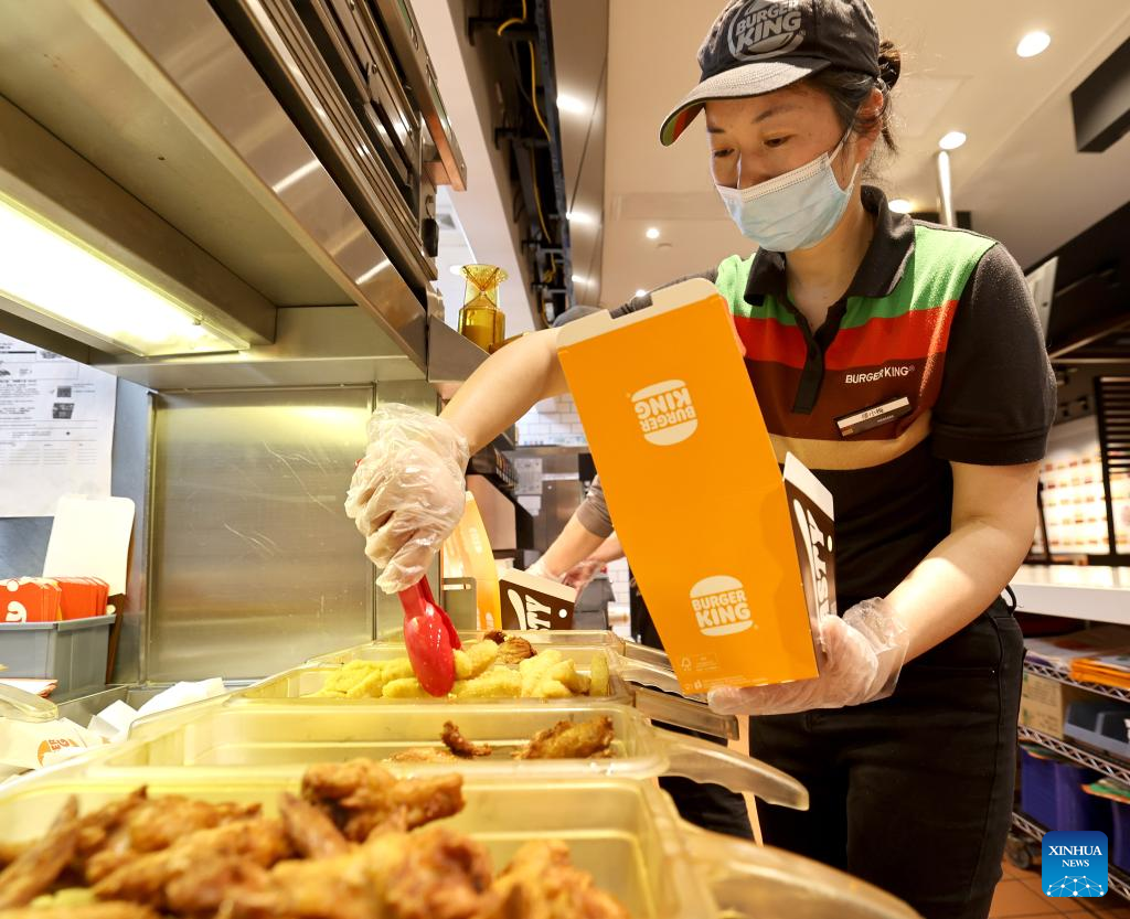An employee packs food for an online order at a Burger King store in east China's Shanghai, April 10, 2022. (Xinhua/Chen Jianli)