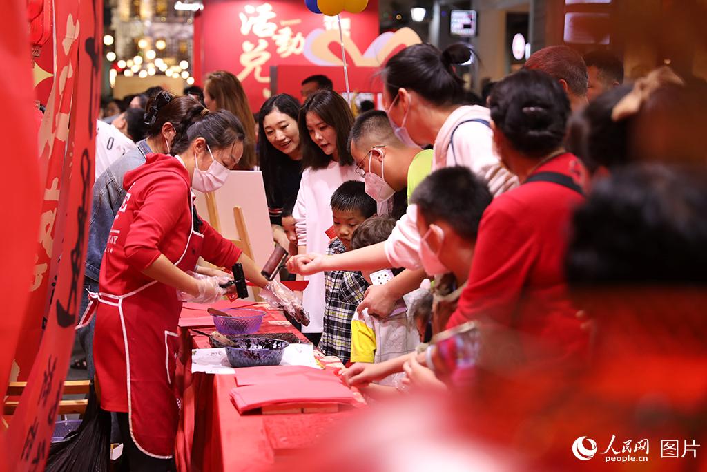 Children learn traditional New Year painting and rubbing in a Lantern Festival themed fair in Haikou, south China’s Hainan Province, on Feb. 5, 2023. (People’s Daily Online/Fu Wuping)