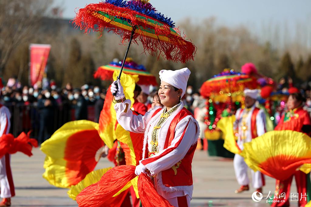A woman performs in a “Shehuo” competition in Yinchuan, northwest China’s Ningxia Hui Autonomous Region, on Feb. 3, 2023. In many rural areas across China, folk parades and celebrations collectively known as "Shehuo" are held to bring the festivities to a climax. (People’s Daily Online/Gao Jiawei)