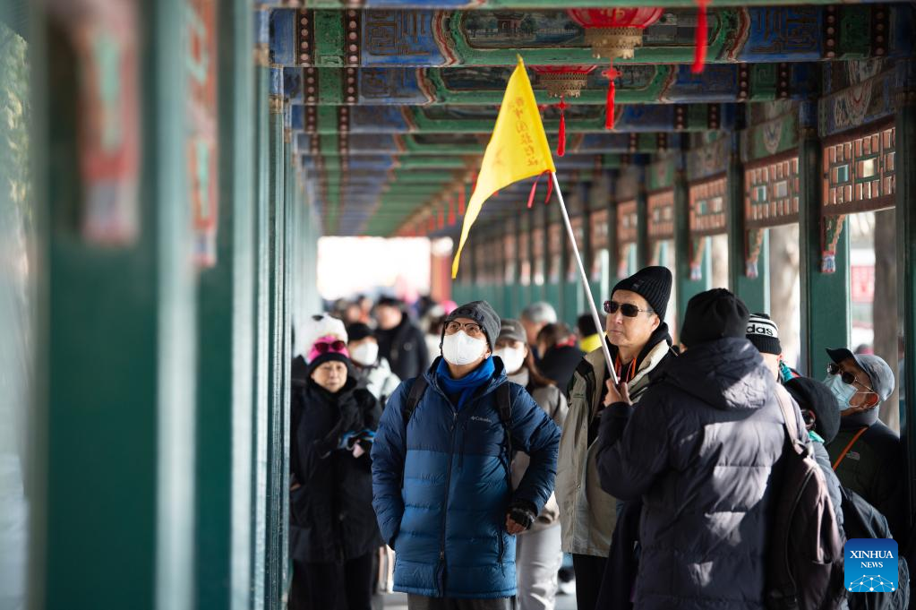 Elderly tourists from Hong Kong visit the Long Corridor, a roofed walkway, in the Summer Palace in Beijing, capital of China, Feb. 7, 2023. (Xinhua/Chen Zhonghao)