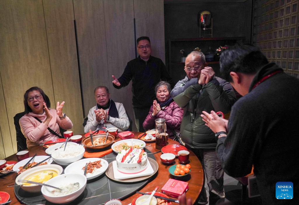 A tourist (2nd R) from Hong Kong celebrates his 69th birthday with a birthday cake prepared by the travel agency in Beijing, capital of China, Feb. 7, 2023. (Xinhua/Chen Zhonghao)