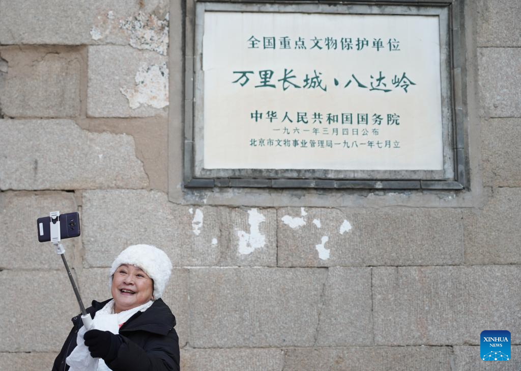 An elderly tourist from Hong Kong takes a selfie at Badaling section of the Great Wall in Beijing, capital of China, Feb. 7, 2023. (Xinhua/Chen Zhonghao)