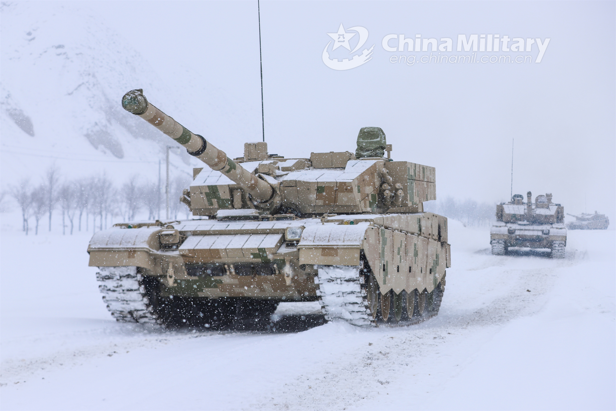 Main battle tanks attached to a tank element of the army rumble through snowfield during a training exercise in late-January, 2023. (eng.chinamil.com.cn/Photo by He Rui)