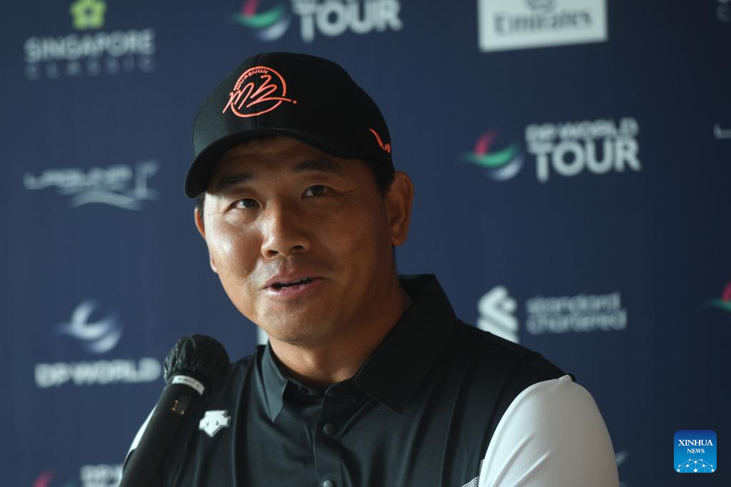 Wu Ashun of China attends the pre-event press conference of Singapore Classic golf tournament at Laguna National Golf Resort Club in Singapore, Feb. 8, 2023. (Photo by Then Chih Wey/Xinhua)