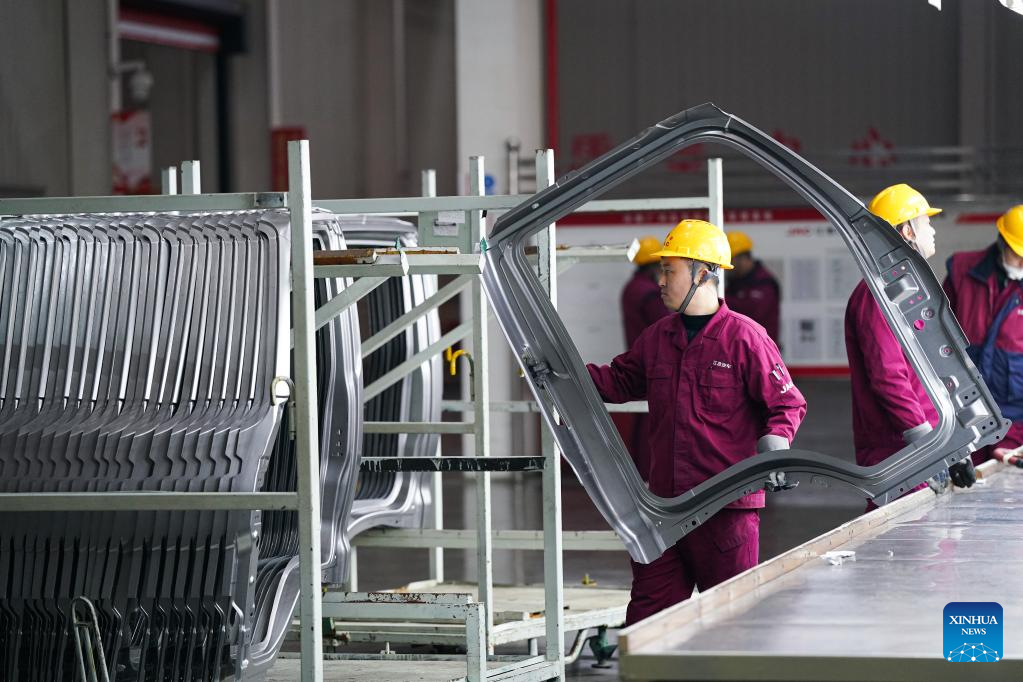 An employee works on a truck assembly line at a production base of Anhui Jianghuai Automobile Group Corp. Ltd. in Hefei, east China's Anhui Province, Feb. 8, 2023. (Xinhua/Liu Junxi)