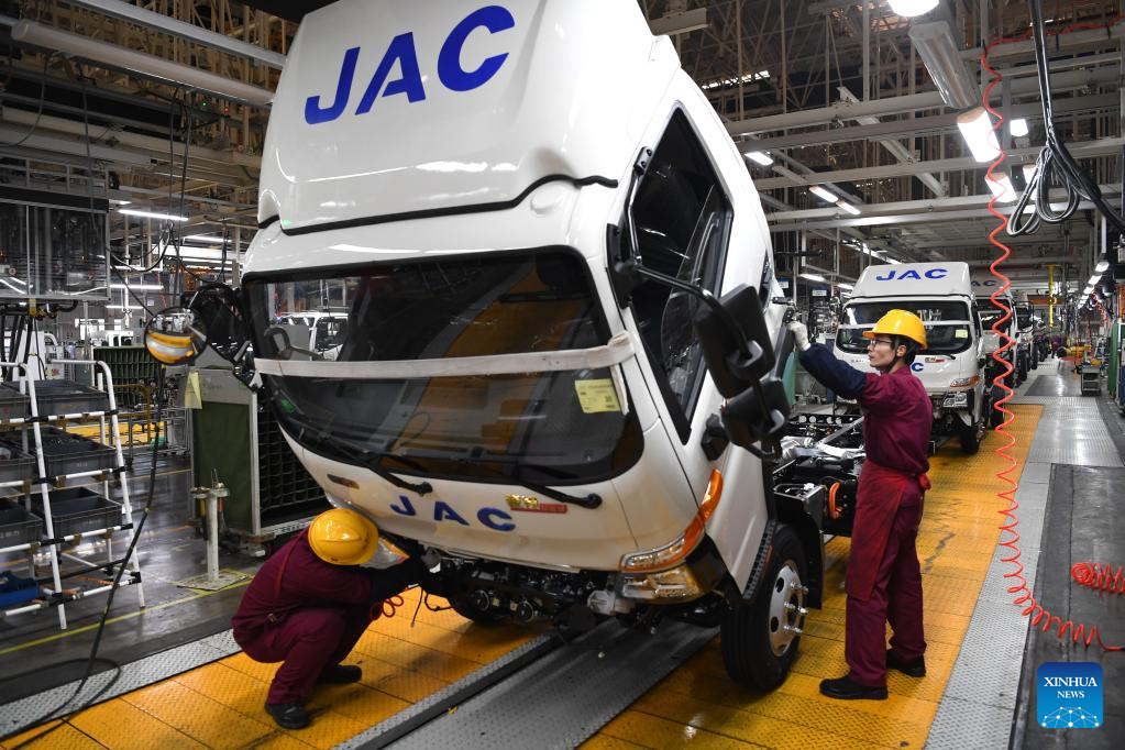 Employees work on a truck assembly line at a production base of Anhui Jianghuai Automobile Group Corp. Ltd. in Hefei, east China's Anhui Province, Feb. 8, 2023. (Xinhua/Cao Li)