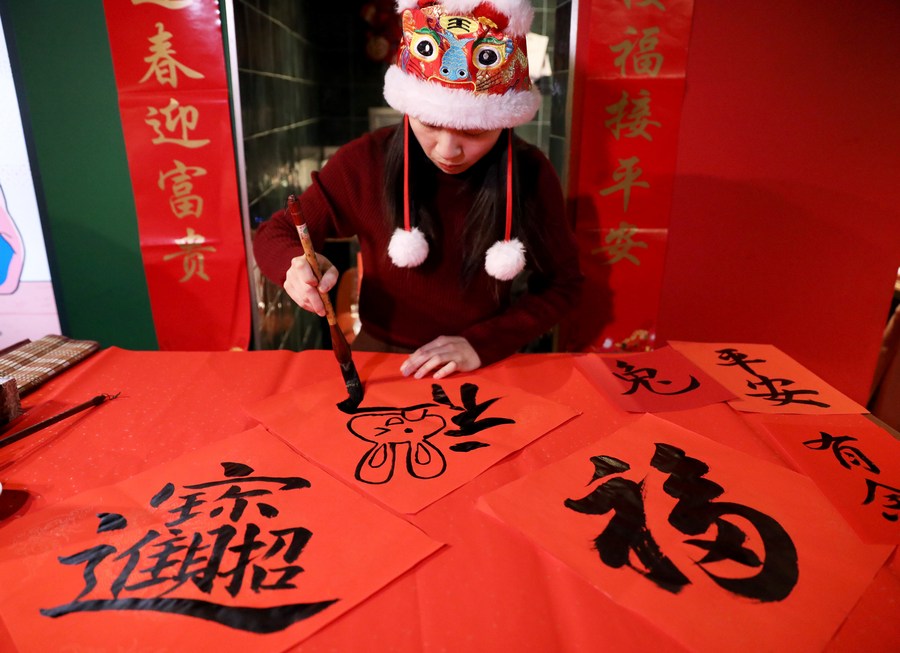 BA woman writes Chinese calligraphy during "Exploring Yummy Chongqing in London" event in London, Britain, Feb. 2, 2023. (Xinhua/Li Ying)