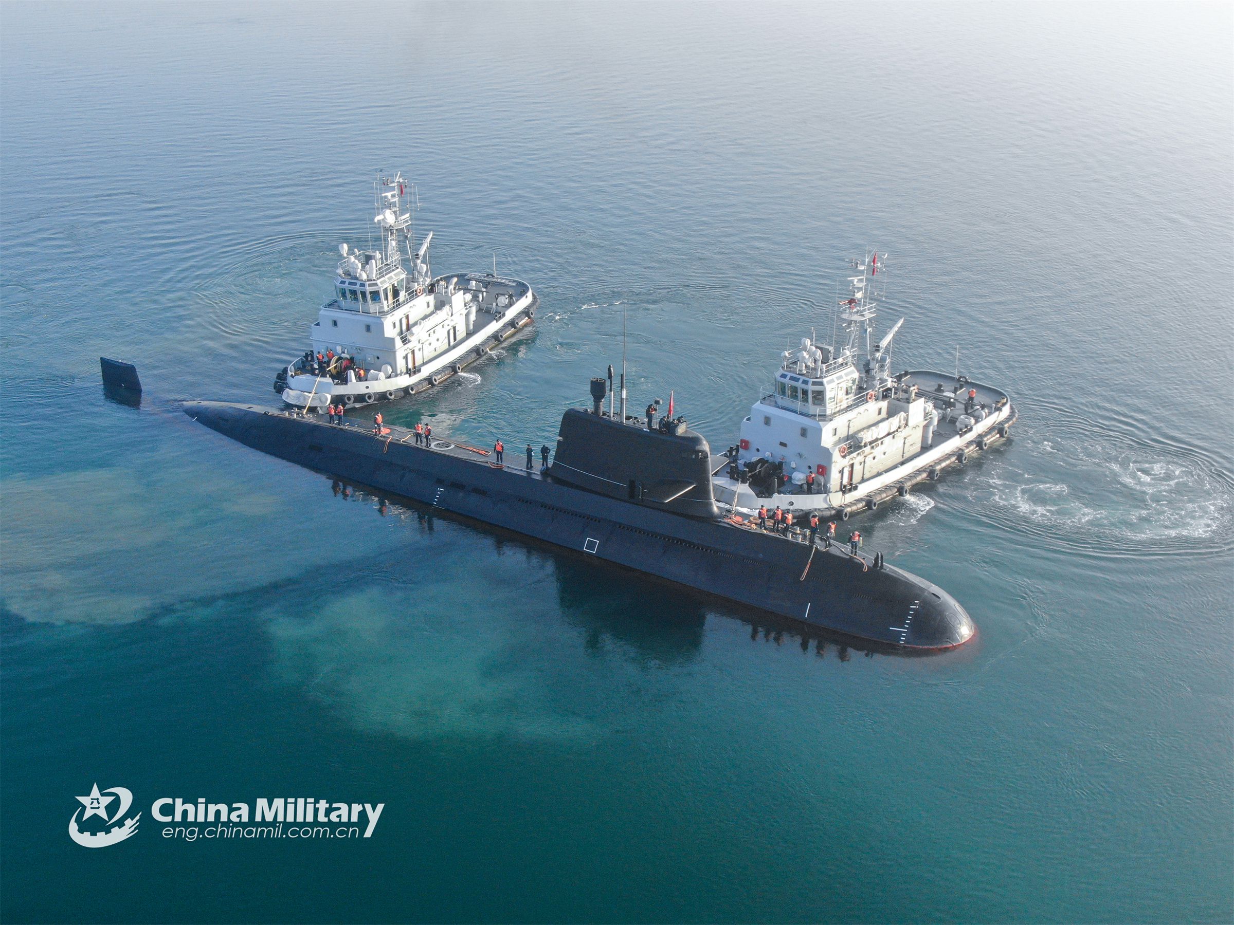 Two towboats attached to a naval submarine flotilla under the PLA Northern Theater Command tow a submarine to bear off a port for real-combat training recently. (eng.chinamil.com.cn/Photo by Wu Haodong)