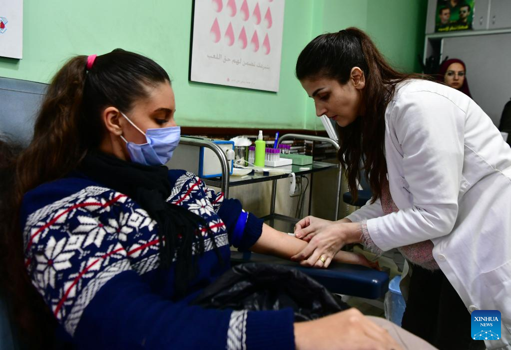 A woman donates blood at a blood donation center in Damascus, capital of Syria, Feb. 8, 2023. The death toll from Monday's devastating earthquakes in Trkiye and Syria has surpassed 17,000, according to latest data. In Syria, at least 1,581 were killed in government-held areas, and the death toll in the opposition-held region is 1,975, according to media reports. (Photo by Ammar Safarjalani/Xinhua)