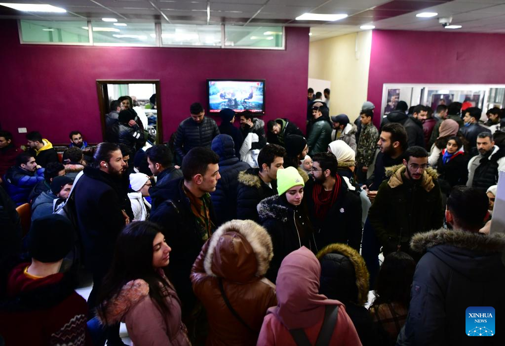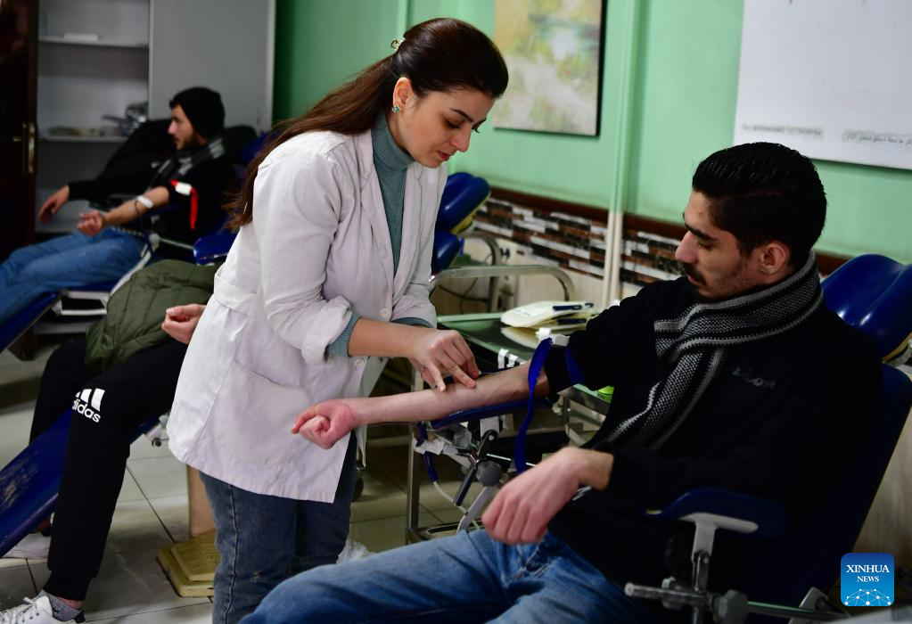 People donate blood at a blood donation center in Damascus, capital of Syria, Feb. 8, 2023. The death toll from Monday's devastating earthquakes in Trkiye and Syria has surpassed 17,000, according to latest data. In Syria, at least 1,581 were killed in government-held areas, and the death toll in the opposition-held region is 1,975, according to media reports. (Photo by Ammar Safarjalani/Xinhua)