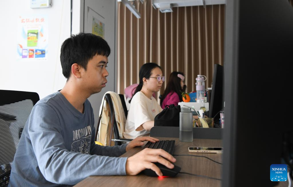 Employees work at an office in Fullsing Internet Industrial Park in Haikou, south China's Hainan Province, Feb. 8, 2023. In 2022, the key parks of Hainan Free Trade Port completed a total investment in fixed assets of 126.15 billion yuan (about 18.62 billion U.S. dollars), a year-on-year increase of 6.6 percent. The accumulated operating income was 1.82 trillion yuan (about 269.32 billion U.S. dollars), a year-on-year increase of 31.6 percent. (Xinhua/Yang Guanyu)