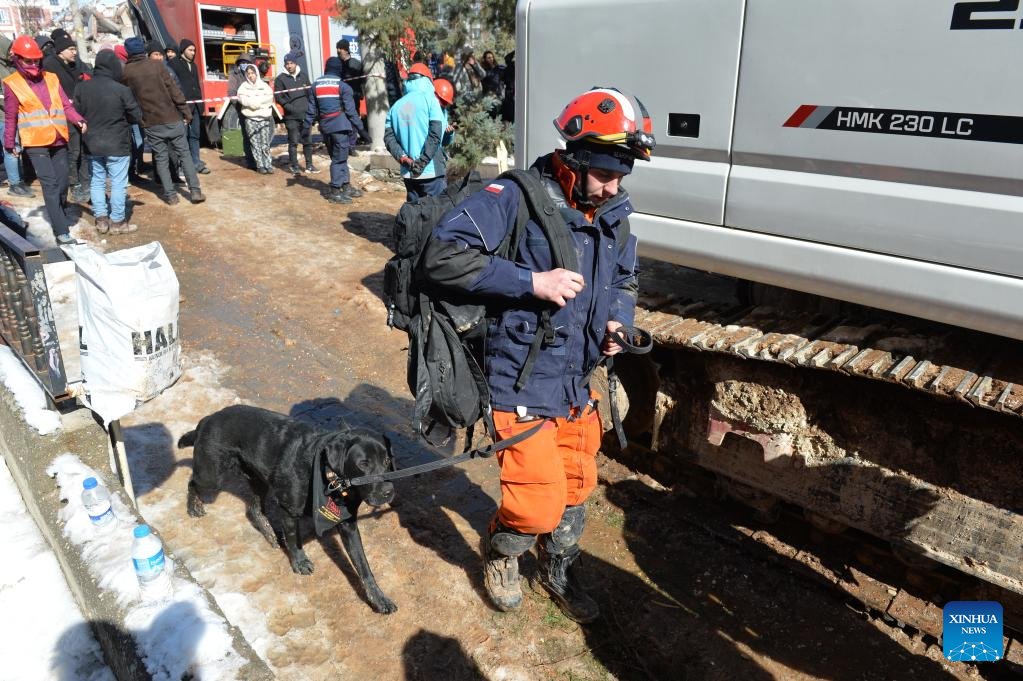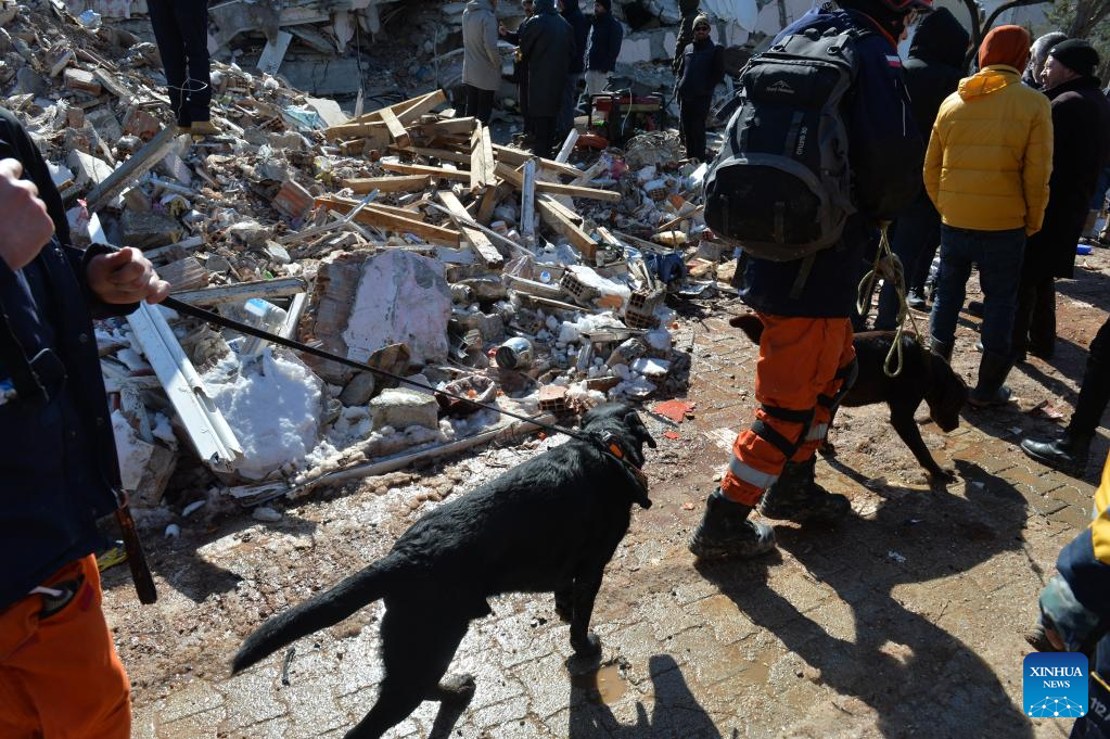Rescuers carry out rescue operation with rescue dogs in Adiyaman, Trkiye, Feb. 8, 2023. The death toll from Monday's devastating earthquakes in Trkiye and Syria has surpassed 17,000, according to latest data. (Photo by Mustafa Kaya/Xinhua)