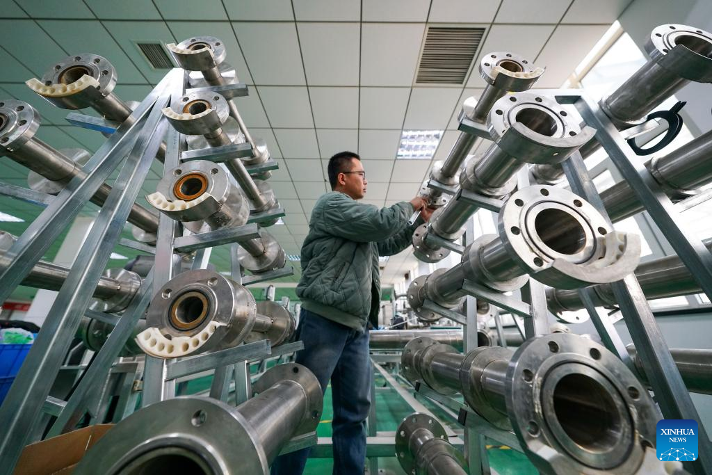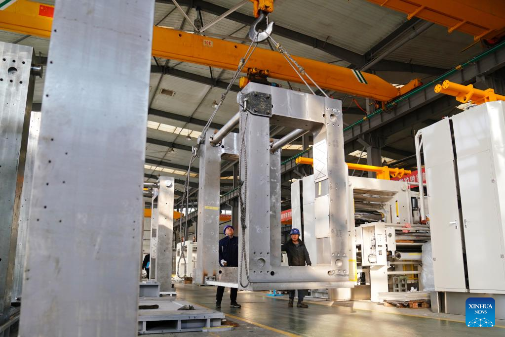 Workers hoist accessories in the workshop of Naknor Technology in Xingtai, north China's Hebei Province, on Feb. 6, 2023. Hebei Province has focused on improving the innovation ability of small and medium enterprises and adopted a series of measures to support them. (Xinhua/Mu Yu)