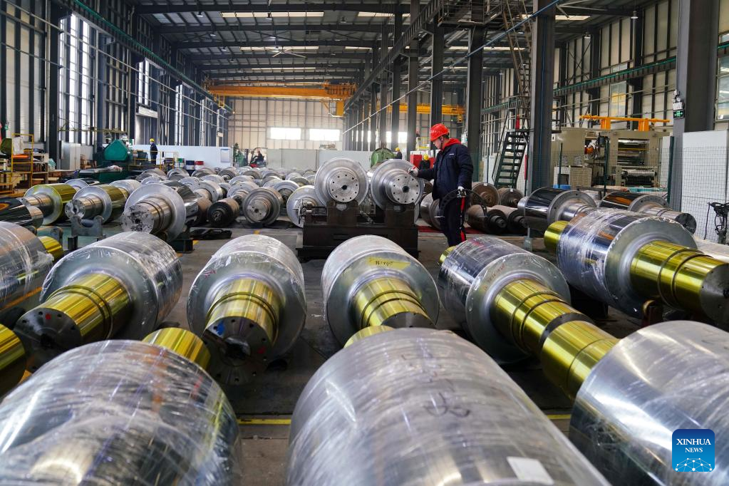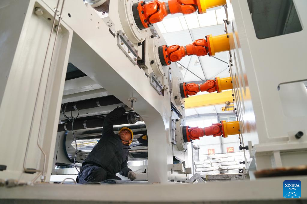 A worker measures the roll size at Naknor Technology in Xingtai, north China's Hebei Province, on Feb. 6, 2023. Hebei Province has focused on improving the innovation ability of small and medium enterprises and adopted a series of measures to support them. (Xinhua/Mu Yu)