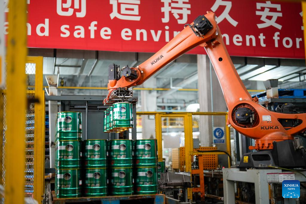 A robot works at a waterproof technology company in Tangshan, north China's Hebei Province, on Feb. 2, 2023. Hebei Province has focused on improving the innovation ability of small and medium enterprises and adopted a series of measures to support them. (Xinhua/Mu Yu)