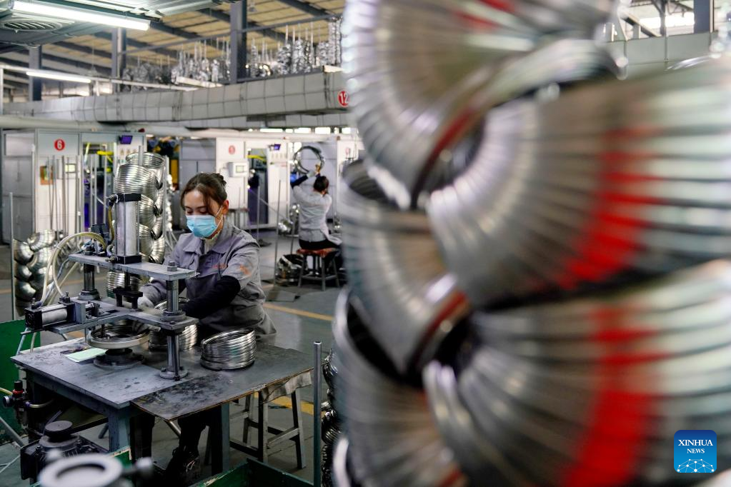 Workers are seen in the production line at a kitchenware company in Shahe, north China's Hebei Province, on Feb. 6, 2023. Hebei Province has focused on improving the innovation ability of small and medium enterprises and adopted a series of measures to support them. (Xinhua/Mu Yu)