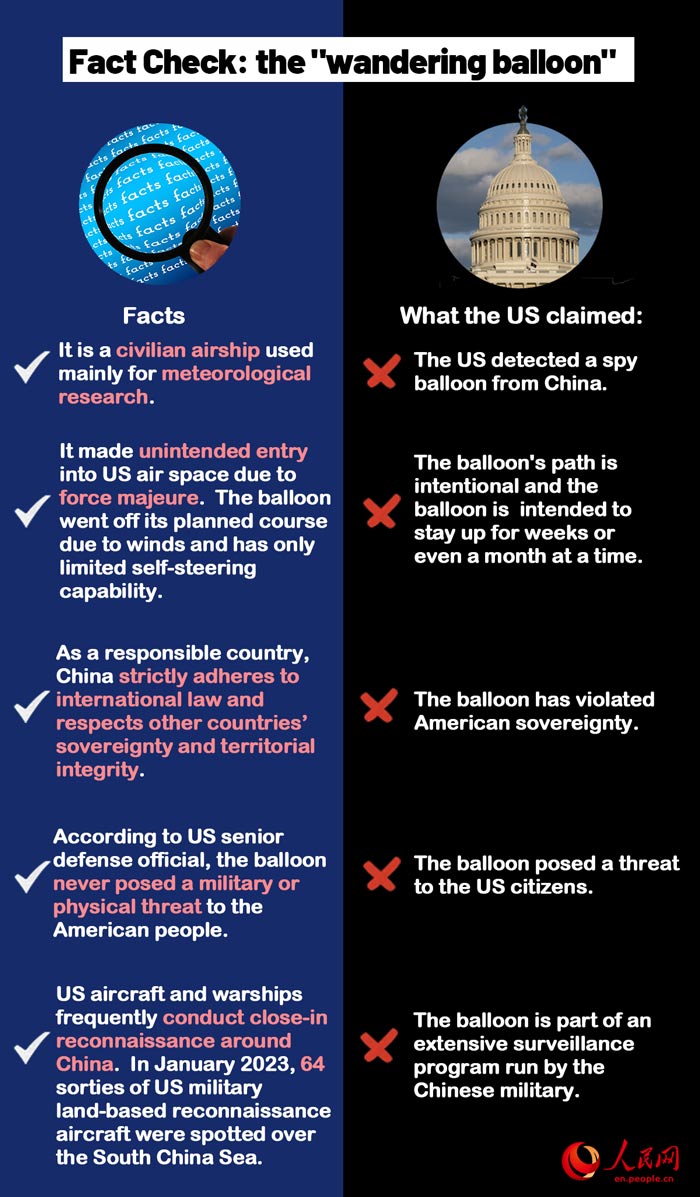 A Chinese civilian unmanned airship unintendedly entered US airspace last week due to force majeure and was shot down by the US military on Saturday. For days, US politicians and media have hyped up this incident, claiming it was a spy in the sky. Is this a part of China's surveillance program or an accidental incident overplayed by US politicians and media to smear China? Here are the facts that People's Daily Online has collected.