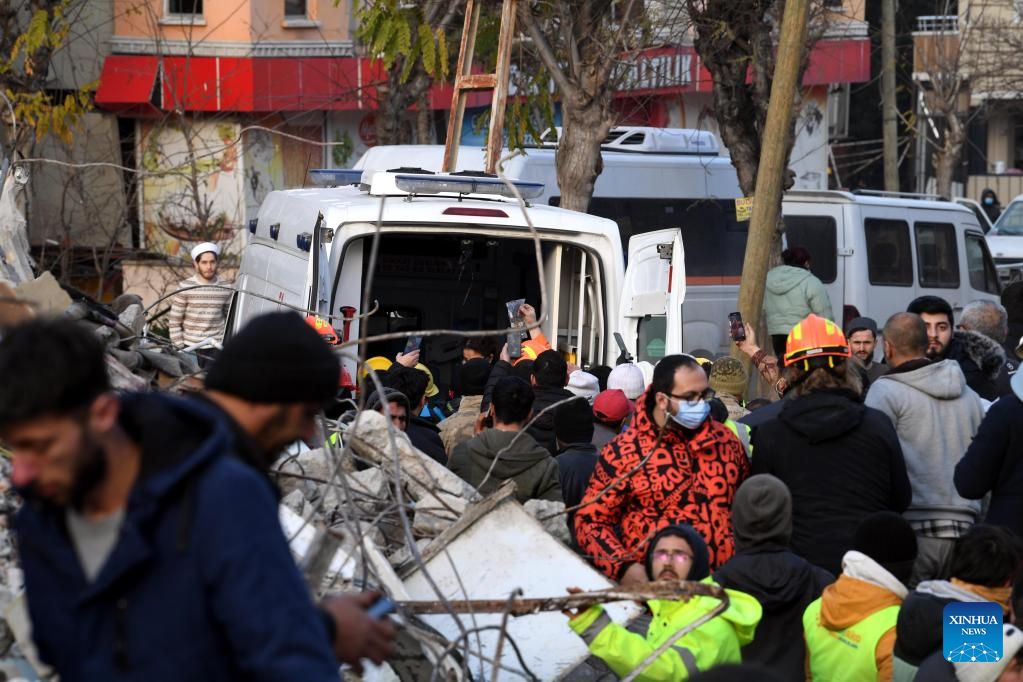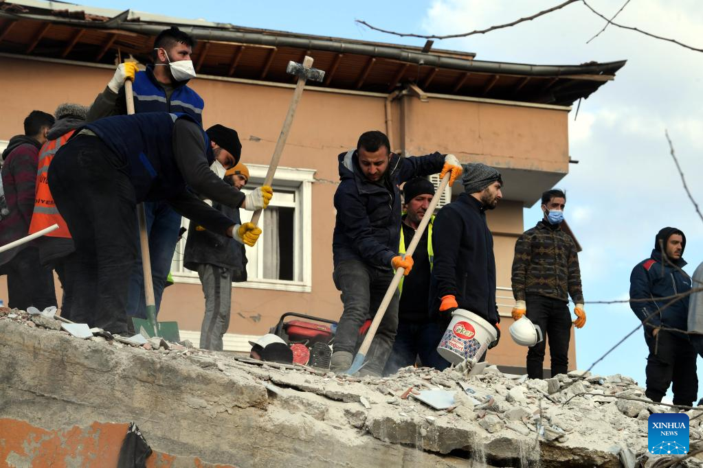 Rescue workers search for survivors among the rubble of a destroyed building in Antakya, Hatay province, Trkiye, on Feb. 10, 2023. The death toll from Monday's devastating earthquakes climbed to 20,213 in Trkiye, while another 80,052 injuries were reported in the country, Turkish Health Minister Fahrettin Koca announced late Friday. (Xinhua/Shadati)