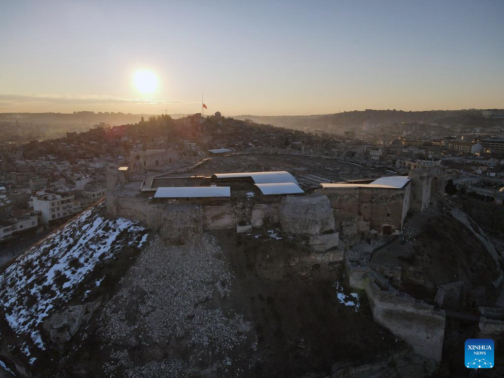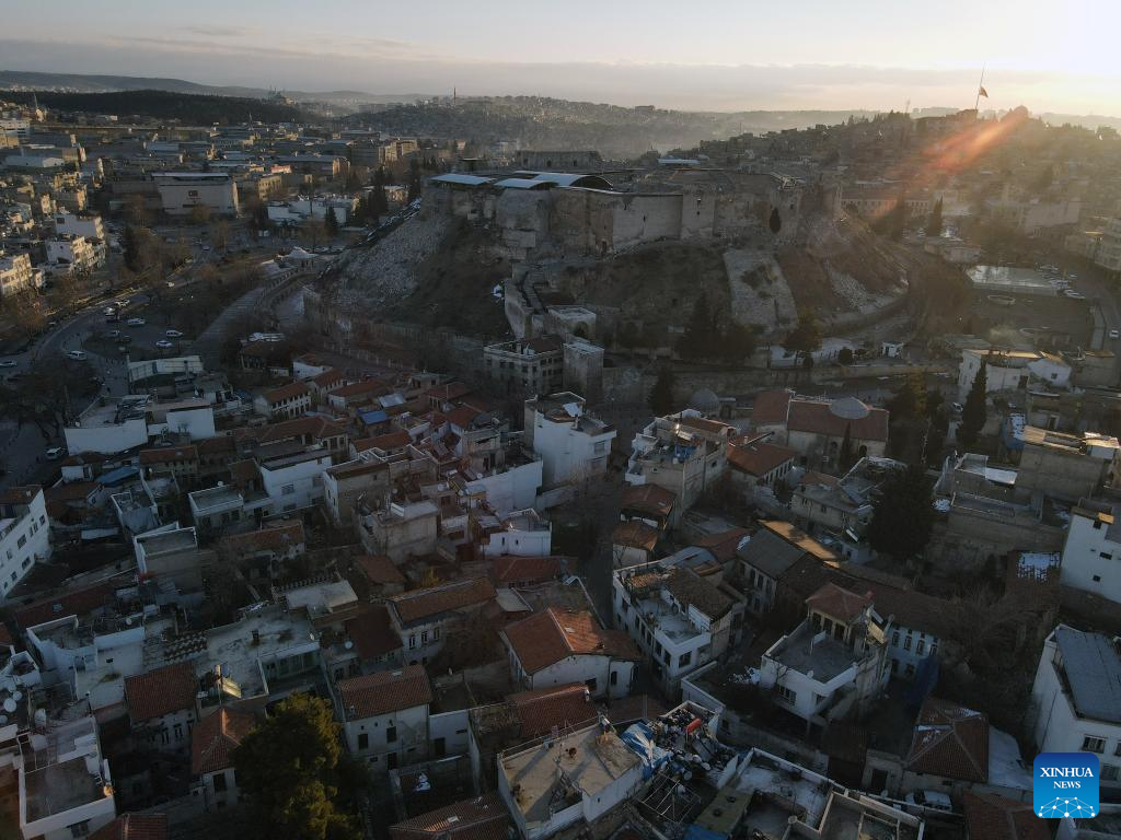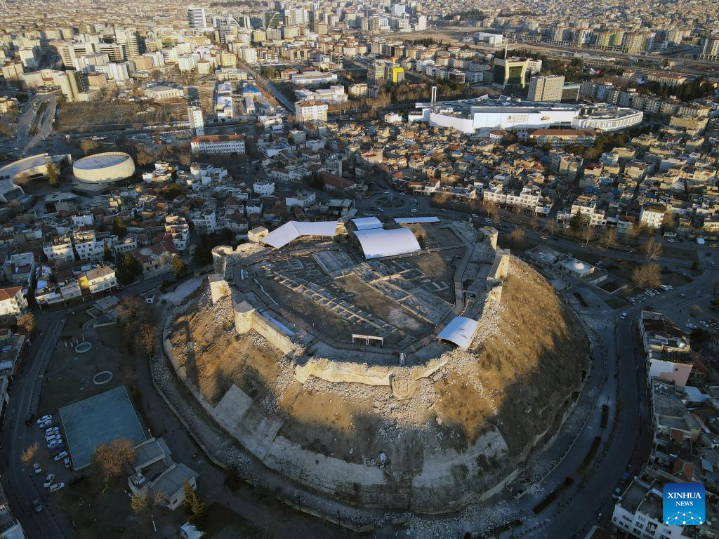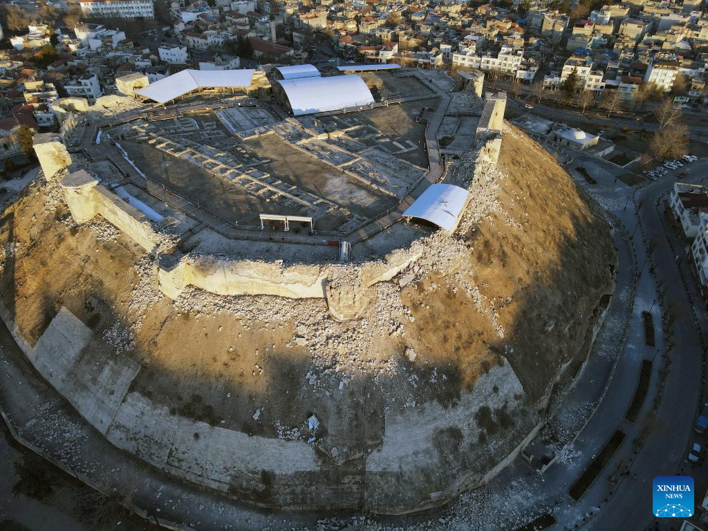 The aerial photo taken on Feb. 10, 2023 shows Gaziantep Castle damaged in the devastating earthquakes in Gaziantep, Trkiye. (Photo by Mustafa Kaya/Xinhua)