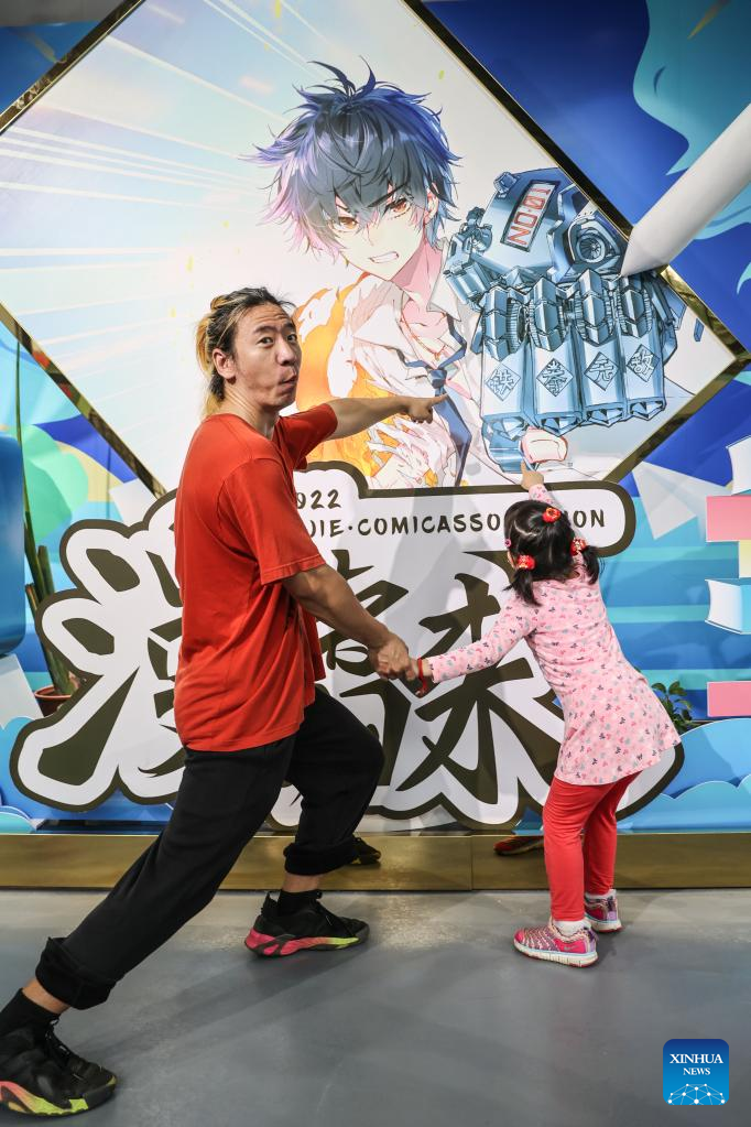 Cartoonist Liu Ke and his daughter pose for a photo in front of his work at the exhibition hall of an animation incubation base in Changxue Village of Longqiao Town, Haikou City, south China's Hainan Province, Feb. 9, 2023. (Xinhua/Zhang Liyun)