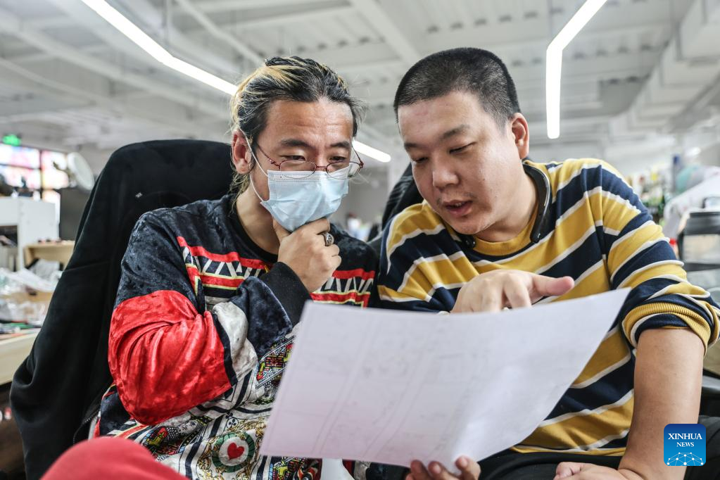 Cartoonist Liu Ke (L) communicates with a colleague at an animation incubation base in Changxue Village of Longqiao Town, Haikou City, south China's Hainan Province, Feb. 1, 2023. (Xinhua/Zhang Liyun)