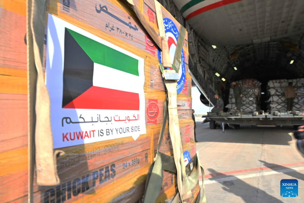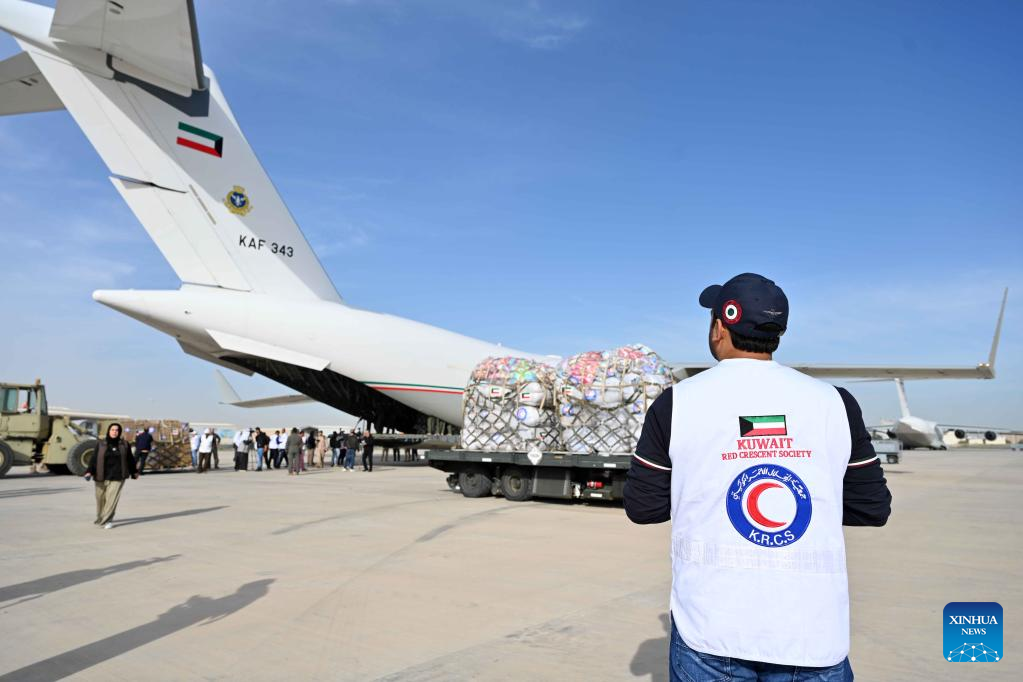 Staff members load supplies provided by Kuwait as humanitarian aid into a plane at Kuwait International Airport in Farwaniya Governorate, Kuwait, Feb. 9, 2023. (Photo by Asad/Xinhua)