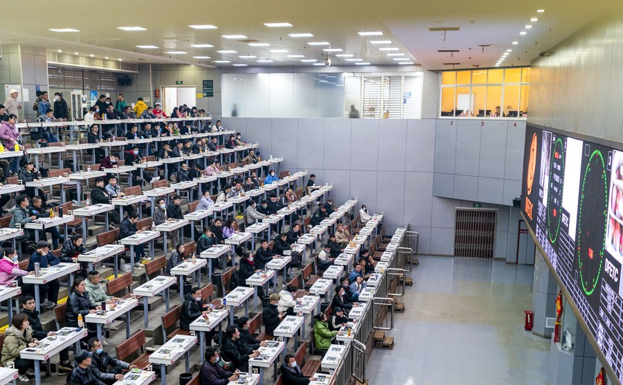 People bid for fresh flowers at the Kunming International Flora Auction Trading Center in Dounan, southwest China's Yunnan Province, Jan. 31, 2023. (Xinhua/Chen Xinbo)