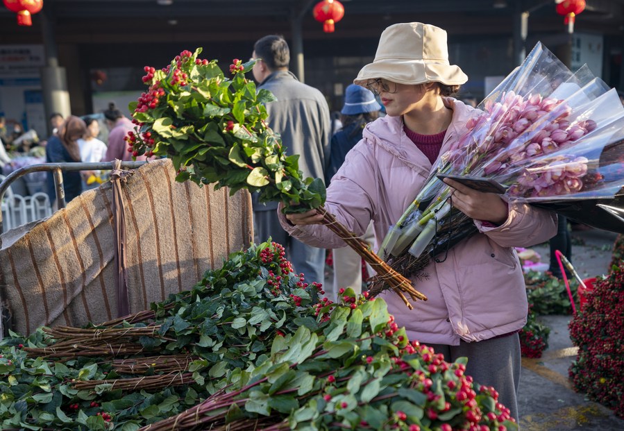 A customer selects flowers at the Kunming Dounan Flower Market in southwest China's Yunnan Province, Jan. 31, 2023. (Xinhua/Chen Xinbo)