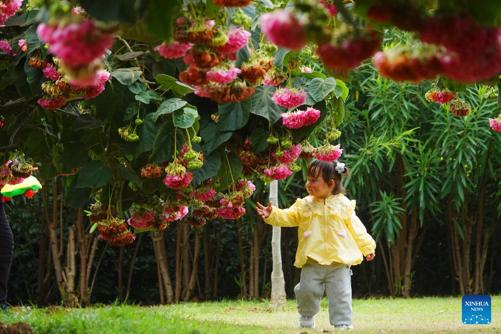 Children play among flowers on Daling Mountain in Gongcheng Yao Autonomous County of Guilin, south China's Guangxi Zhuang Autonomous Region, Feb. 11, 2023. (Photo by Jiang Keqing/Xinhua)