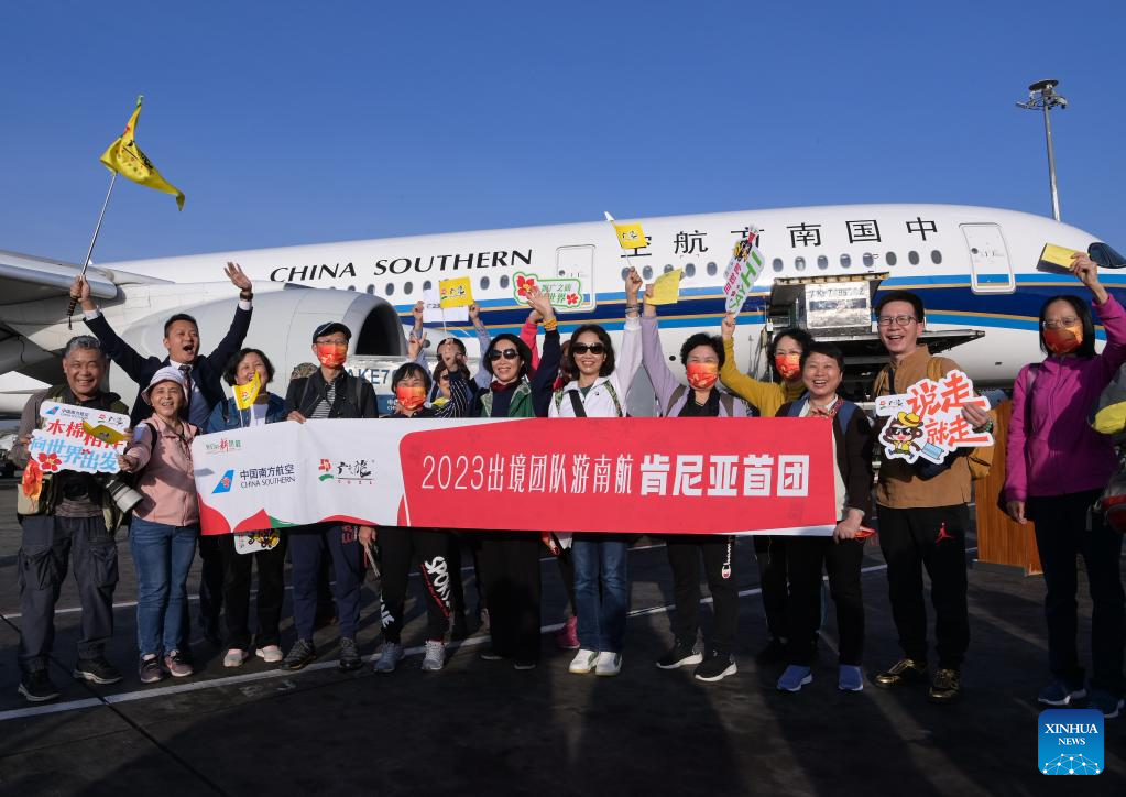 Chinese tourists are welcomed at Jomo Kenyatta International Airport in Nairobi, Kenya, Feb. 11, 2023. A flight carrying 40 Chinese group tourists arrived at Jomo Kenyatta International Airport in Nairobi on Saturday. This is the first outbound tour group from China to Kenya since China resumed outbound group travel to 20 countries. (Xinhua/Han Xu)