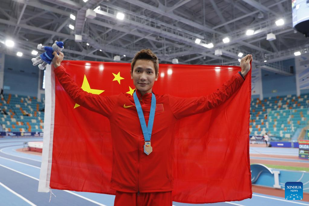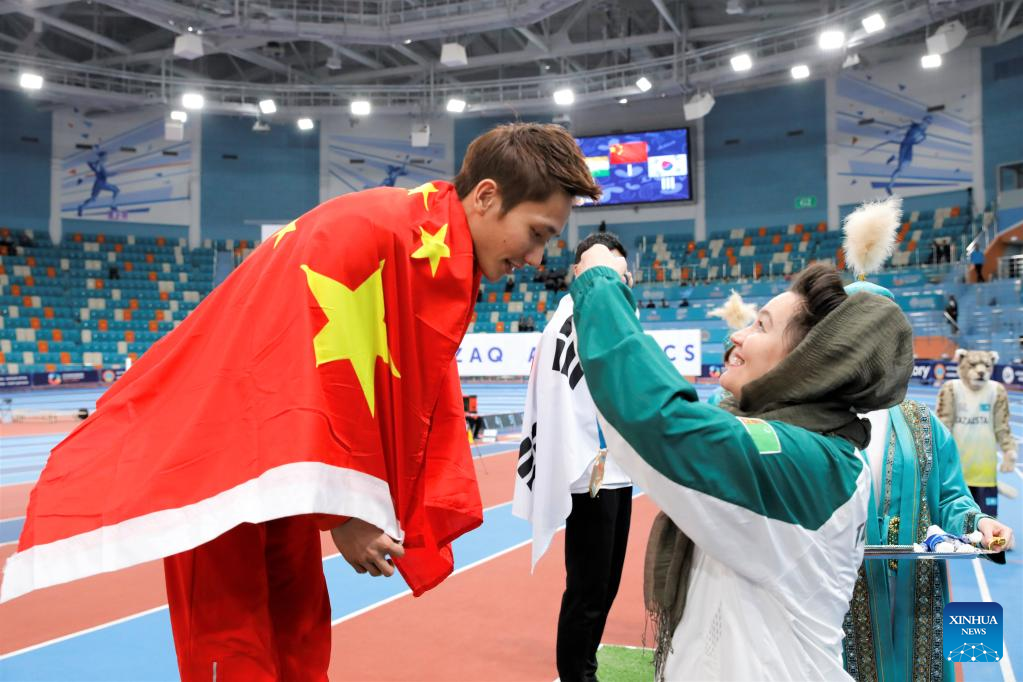 Gold medalist Fang Yaoqing of China poses for photos during the awarding ceremony of men's triple jump at the 10th Asian Indoor Athletics Championships in Astana, Kazakhstan, on Feb. 11, 2023. (Photo by Kalizhan Ospanov/Xinhua)