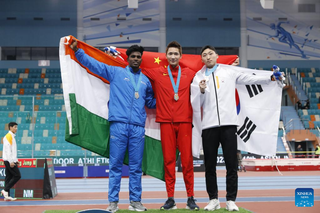 Gold medalist Fang Yaoqing (C) of China, silver medalist Praveen Chithravel (L) of India and bronze medalist Yu Gyumin of South Korea pose for photos during the awarding ceremony of men's triple jump at the 10th Asian Indoor Athletics Championships in Astana, Kazakhstan, on Feb. 11, 2023. (Photo by Kalizhan Ospanov/Xinhua)
