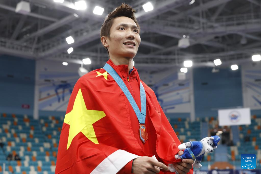 Gold medalist Fang Yaoqing of China reacts during the awarding ceremony of men's triple jump at the 10th Asian Indoor Athletics Championships in Astana, Kazakhstan, on Feb. 11, 2023. (Photo by Kalizhan Ospanov/Xinhua)