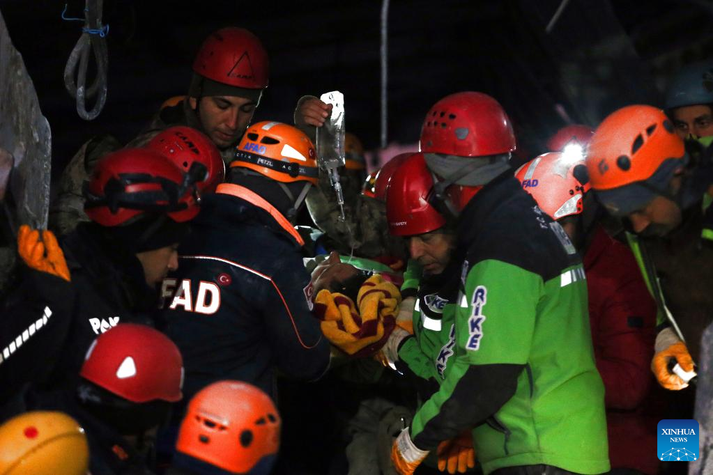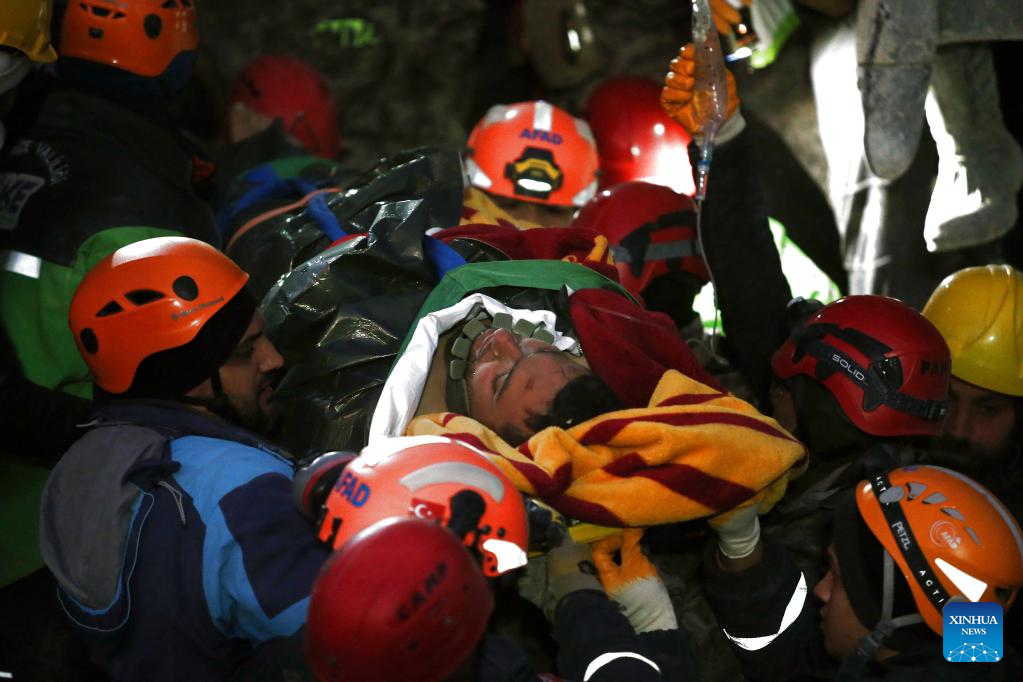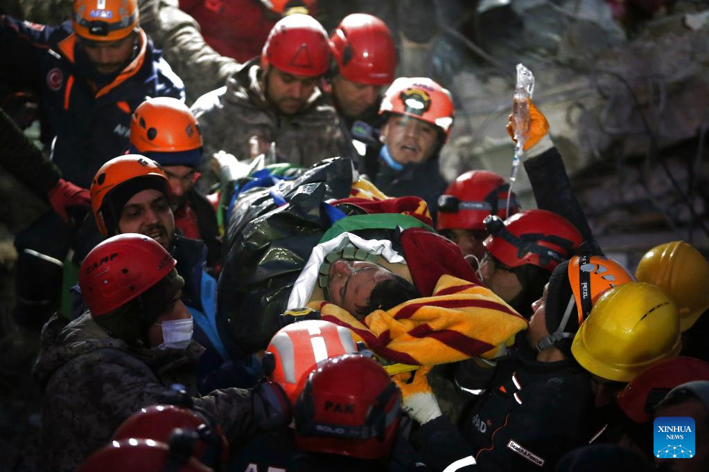 Rescuers transfer a survivor in Gaziantep, Trkiye, Feb. 10, 2023. Massive earthquakes rocked southern Trkiye and northern Syria on Monday. The death toll from Monday's devastating earthquakes has climbed to 20,213 in Trkiye, while another 80,052 injuries were reported in the country, Turkish Health Minister Fahrettin Koca announced late Friday. (Photo by Mustafa Kaya/Xinhua)