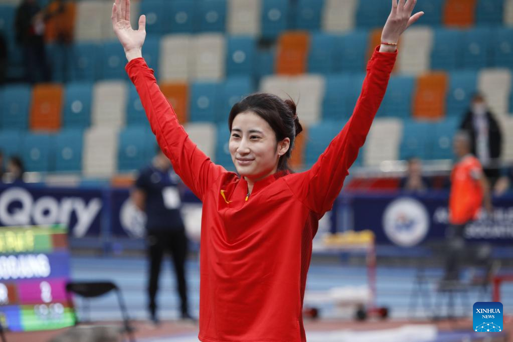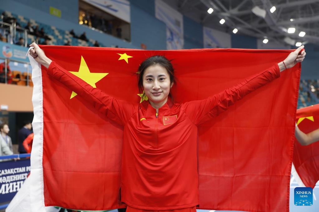 Chen Ting of China celebrates after the women's triple jump event at the 10th Asian Indoor Athletics Championships in Astana, Kazakhstan, Feb. 11, 2023. (Photo by Kalizhan Ospanov/Xinhua)