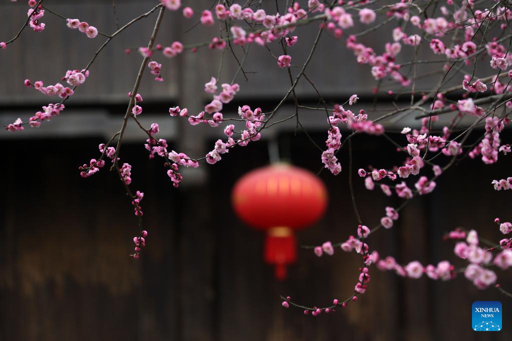 This photo taken on Feb. 12, 2023 shows plum blossoms in Zhuoshui ancient town in Qianjiang District, southwest China's Chongqing. (Photo by Yang Min/Xinhua)