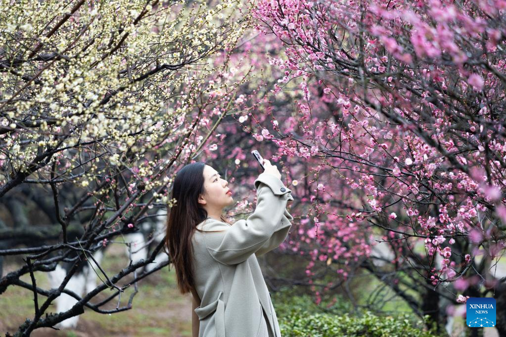 A tourist takes photos of plum blossoms at Gulin park in Nanjing, east China's Jiangsu Province, Feb. 12, 2023. (Photo by Su Yang/Xinhua)