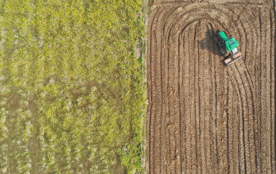 Aerial photo taken on March 2, 2022 shows Gu Bingfa driving a farm machinery on the field in Jin'an Village, Gangshang Town in Nanchang County, east China's Jiangxi Province. (Xinhua/Peng Zhaozhi)