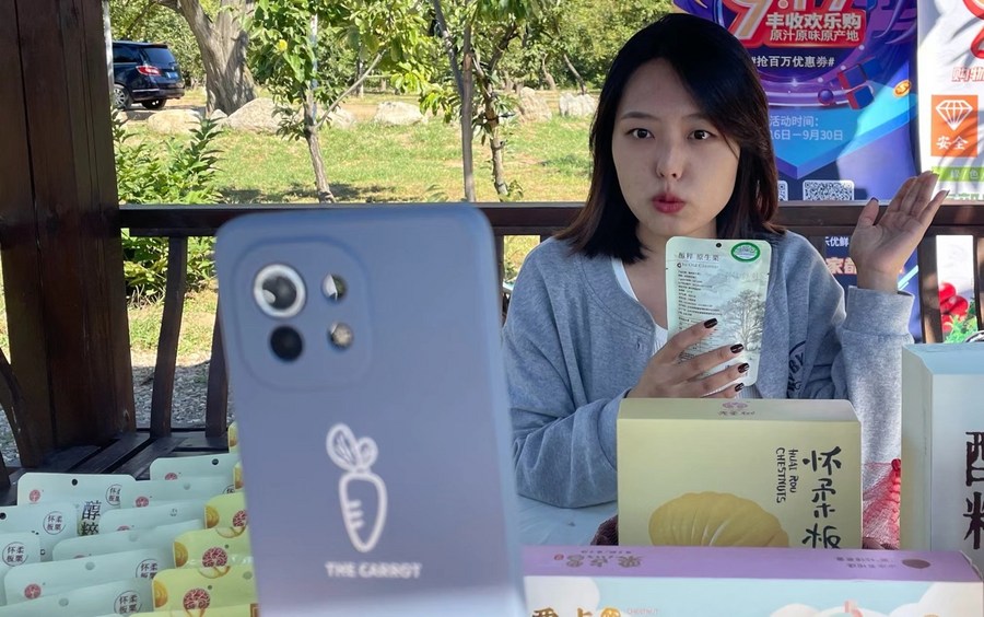 An employee promotes chestnut products through live-streaming at a chestnut farm in Bohai township of Huairou district, Beijing, capital of China, Sept. 20. 2022. (Xinhua/Tian Chenxu)