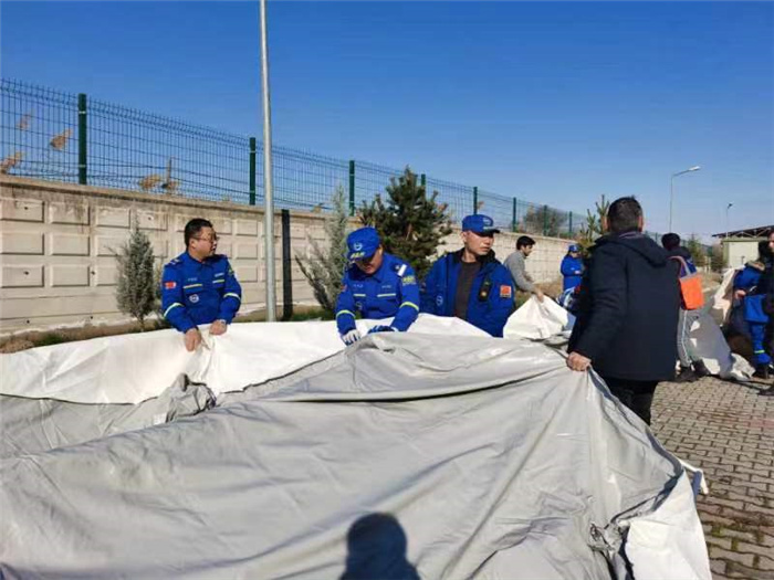Photo shows the Blue Sky Rescue Team helping international rescue teams set up camp in Malatya, Türkiye. (Photo provided by Zhang Yunlu)