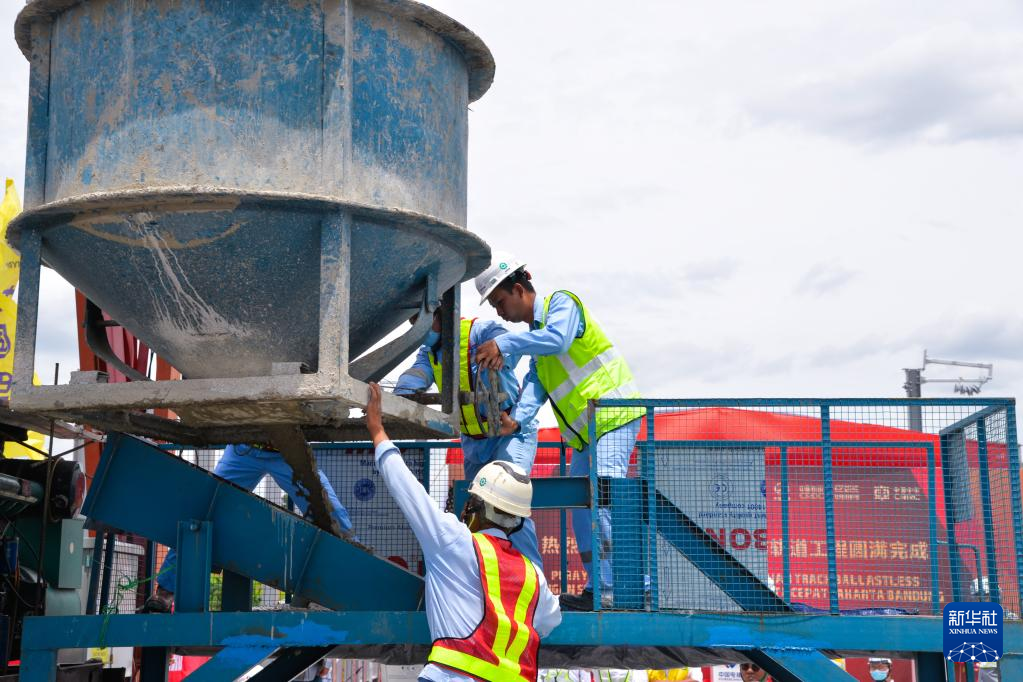 JAKARTA, Feb. 15 (Xinhua) -- With the self-compacting concrete being poured into the last track slab on Wednesday, the construction of ballastless track slabs along the whole line of Jakarta-Bandung High-Speed Railway (HSR) was completed.