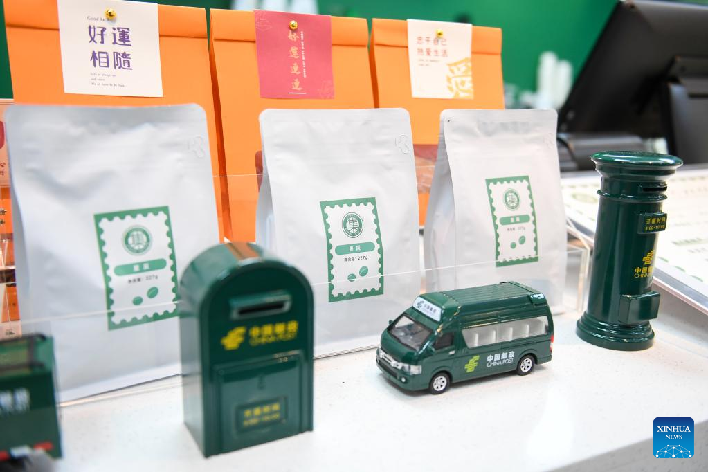 This photo taken on Feb. 15, 2023 shows some packaged coffee beans and cultural and creative products at a coffee-themed post office in Nanshan District in Shenzhen, south China's Guangdong Province. (Xinhua/Mao Siqian)