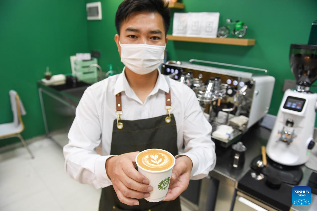 A barista holds a cup of latte made by him at a coffee-themed post office in Nanshan District in Shenzhen, south China's Guangdong Province, Feb. 15, 2023. (Xinhua/Mao Siqian)