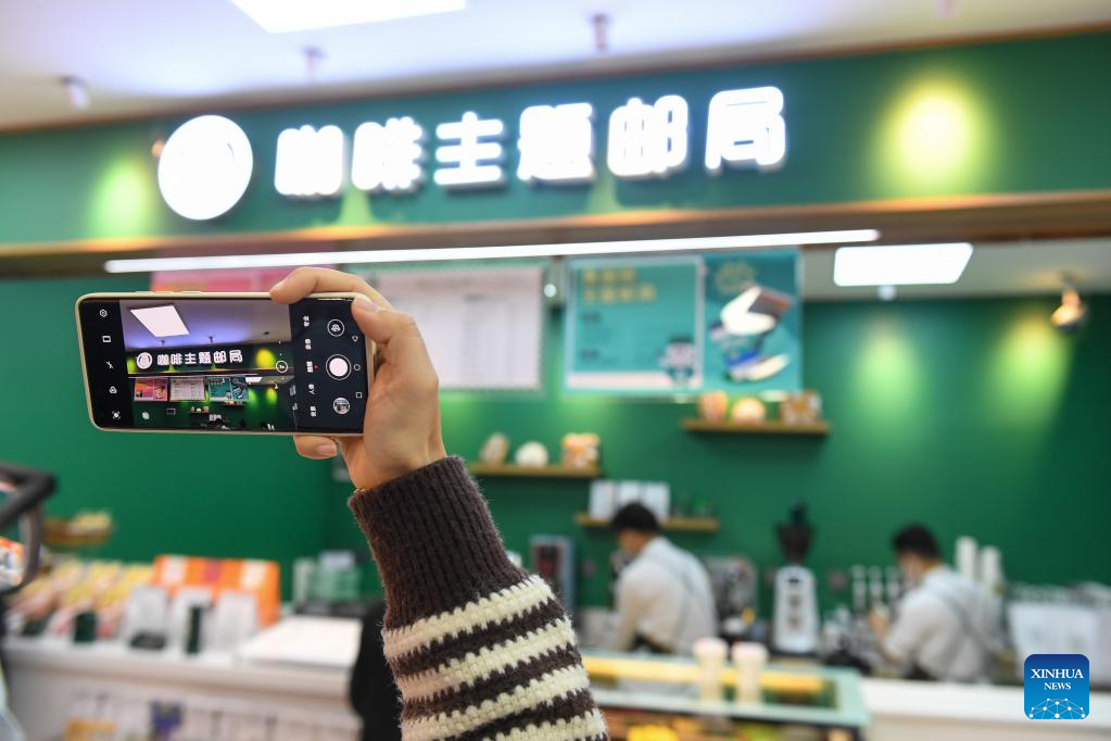 A customer takes a photo of the coffee bar at a coffee-themed post office in Nanshan District in Shenzhen, south China's Guangdong Province, Feb. 15, 2023. (Xinhua/Mao Siqian)