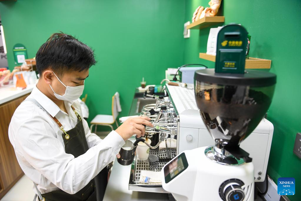 A barista makes coffee at a coffee-themed post office in Nanshan District in Shenzhen, south China's Guangdong Province, Feb. 15, 2023. (Xinhua/Mao Siqian)