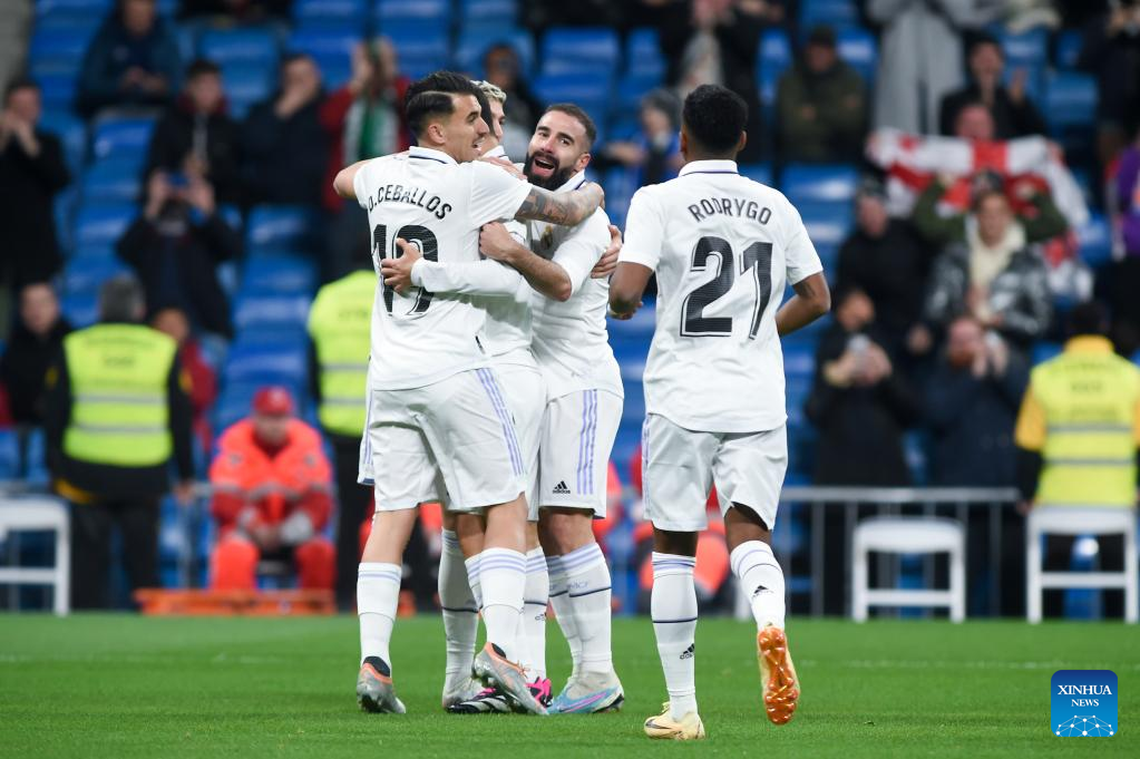 Players of Real Madrid celebrate a goal during a Spanish La Liga football match between Real Madrid and Elche CF in Madrid, Spain, Feb. 15, 2023. (Photo by Gustavo Valiente/Xinhua)