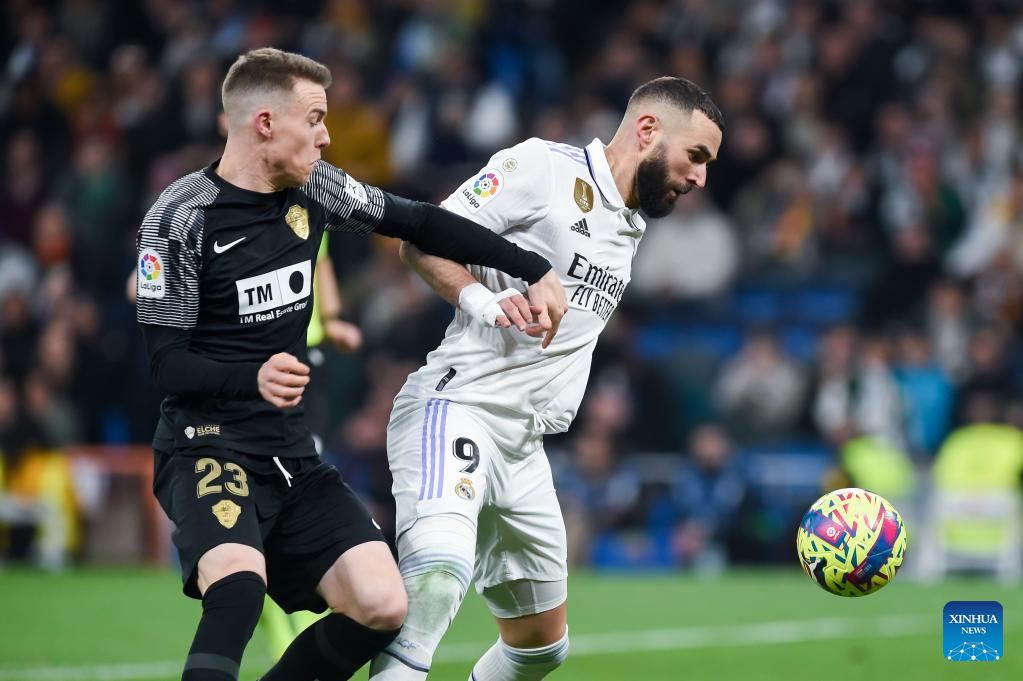 Karim Benzema (R) of Real Madrid vies with Carlos Clerc of Elche a Spanish La Liga football match between Real Madrid and Elche CF in Madrid, Spain, Feb. 15, 2023. (Photo by Gustavo Valiente/Xinhua)