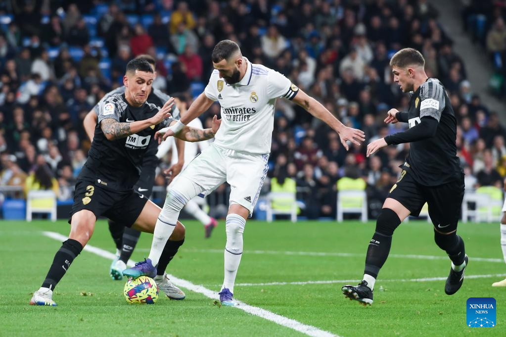 Karim Benzema (C) of Real Madrid vies with Enzo Roco (L) and Raul Guti of Elche during a Spanish La Liga football match between Real Madrid and Elche CF in Madrid, Spain, Feb. 15, 2023. (Photo by Gustavo Valiente/Xinhua)
