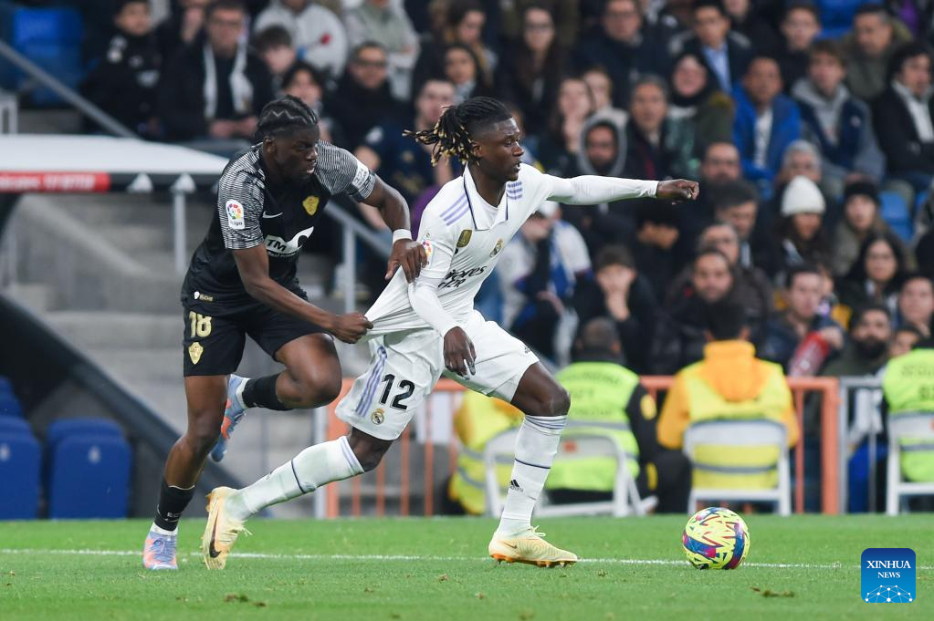 Eduardo Camavinga (R) of Real Madrid vies with Raul Guti of Elche during a Spanish La Liga football match between Real Madrid and Elche CF in Madrid, Spain, Feb. 15, 2023. (Photo by Gustavo Valiente/Xinhua)